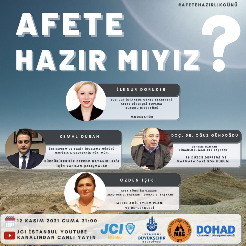 12.11.2021 de Düzce Depremi’nin 22.yılında Afete Dirençli Toplum Etkinliği nde 2021 JCI İstanbul Genel Sekreterimiz ve Afete Dirençli Toplum Kurucu Direktörümüz İlknur Doruker moderatörlüğünde yine harika bir etkinlikte yer aldık.